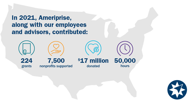 We support our people and the causes they are passionate about through global gift matching and a robust Volunteer Rewards Program. When matched by Ameriprise, advisors and employees generously donated more than $7.75 million to causes they care about.