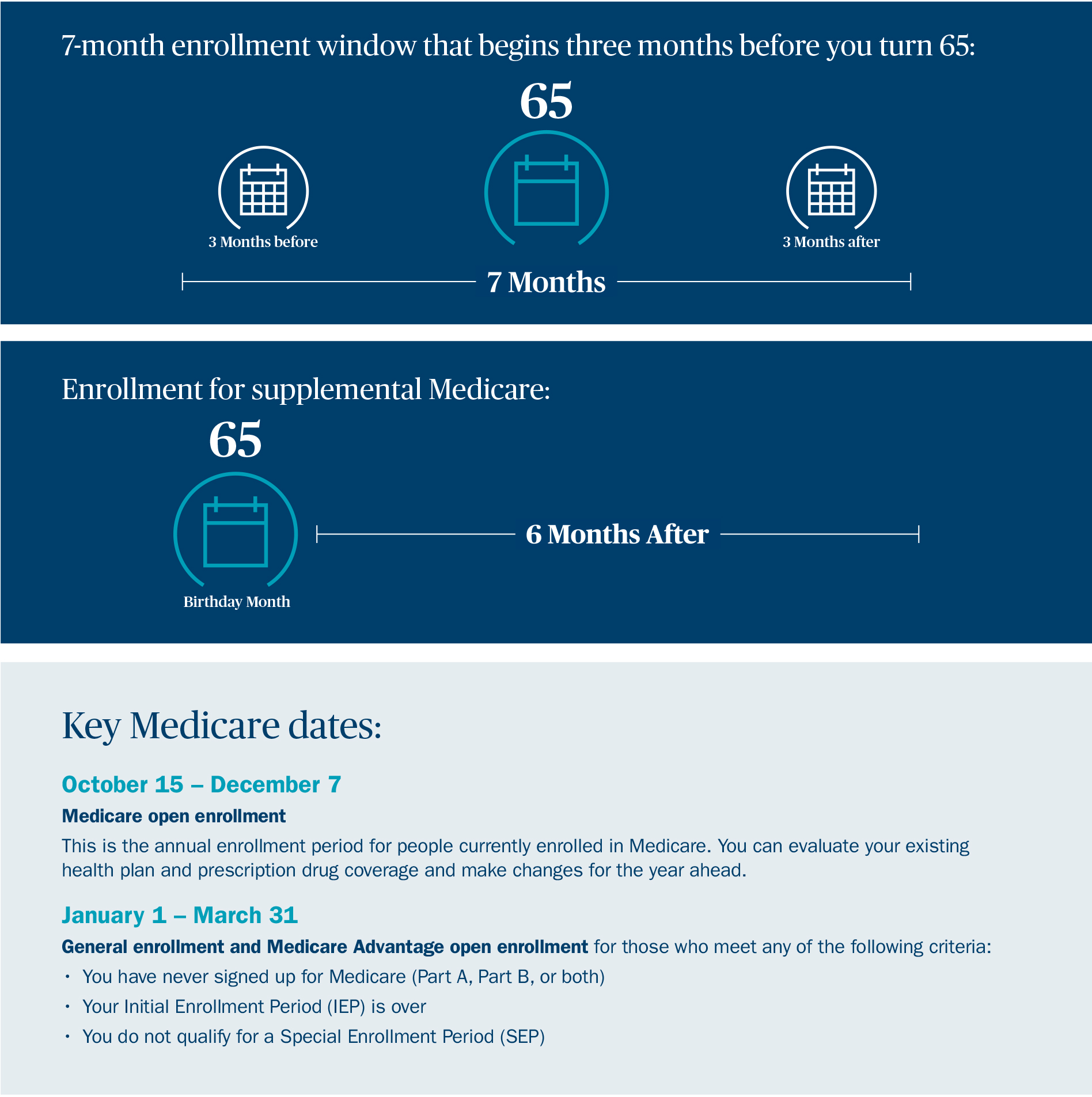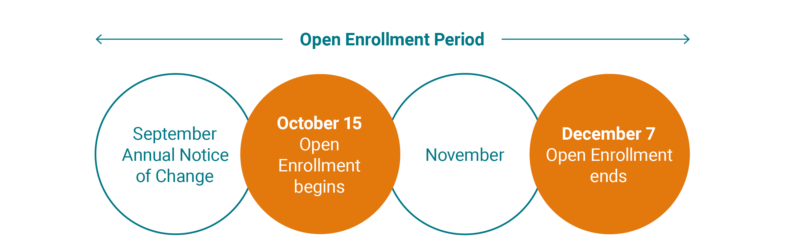 Medicare Open Enrollment (Oct. 15 – Dec. 7): This period is for people already enrolled in Medicare and is when you can make changes to your health or prescription drug coverage for the year ahead.