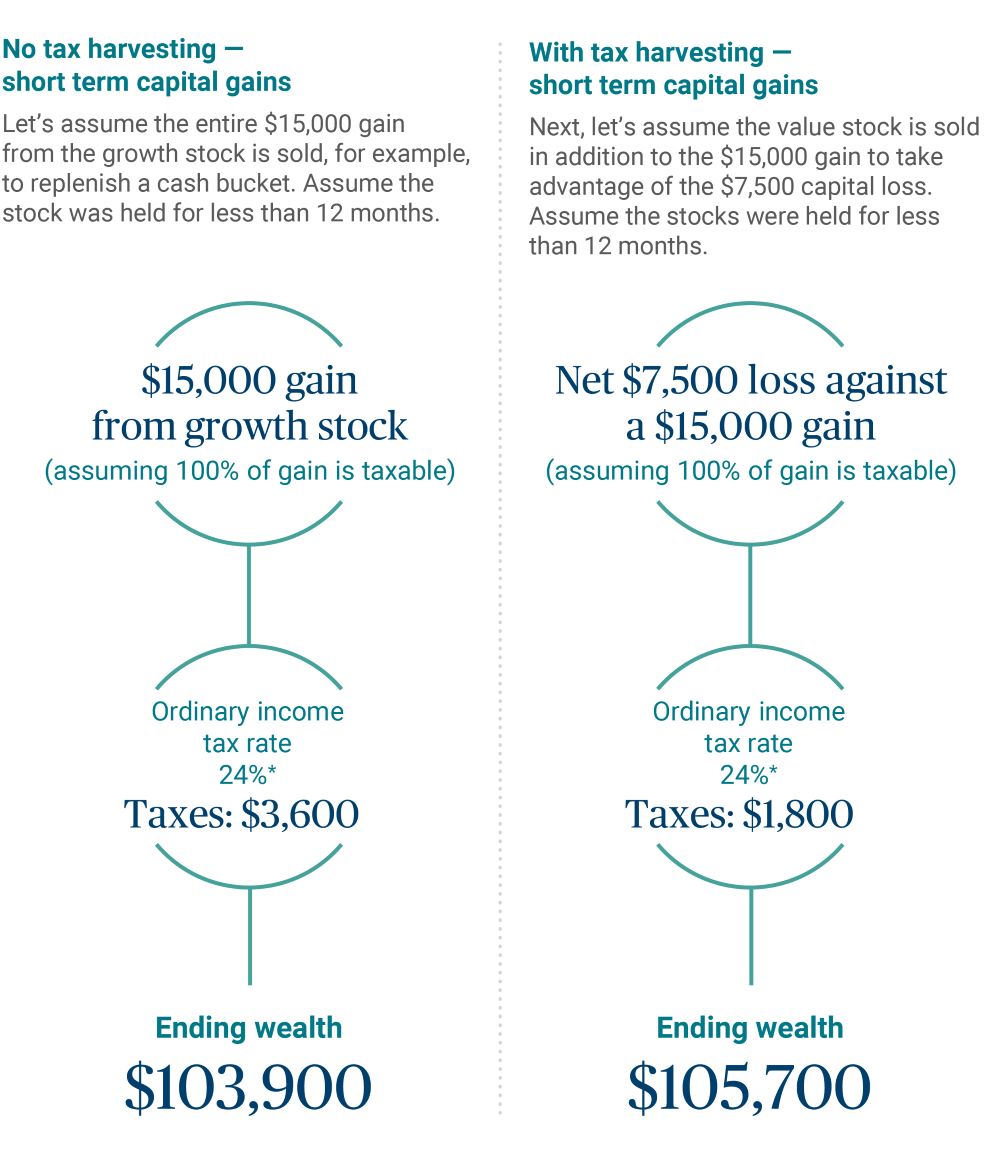 Let's look at the potential impact different tax strategies could have on wealth: 100% gain and netting gains/losses for short-term capital gains. In the example, the ending wealth is $107,500 before taxes. Assume the stocks were held for 12 months or less.