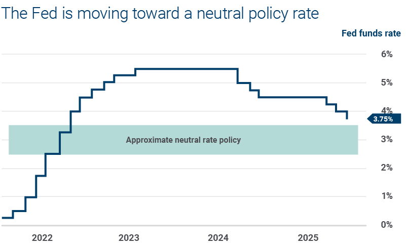 - Fed policy: The Fed’s recent rate cuts place policy rates between 3.50% and 3.75%, approaching what is generally considered a “neutral” position. Inflation is trending toward the 2% target, creating room for additional easing if labor market slack persists.
