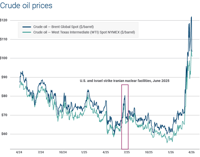 Higher inflation is also a direct threat to economic prospects. As a result of the conflict in Iran and higher energy prices, we’ve lowered our gross domestic product (GDP) growth forecast for 2026 down to +2.2% from the +2.6% from which we started the year. Additional downside should be expected if WTI crude oil were to surpass $120 per barrel for a sustained period of three or more months.