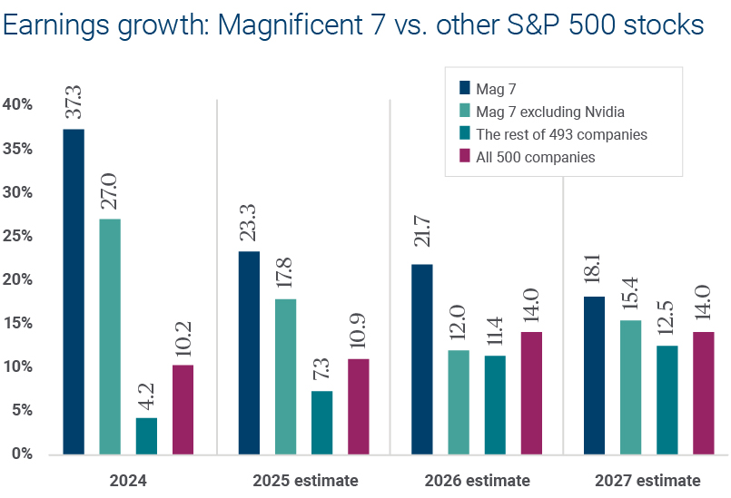 Source: FactSet, American Enterprise Investment Services, Inc. Data as of 11/30/2025. Earnings growth rates are calculated by aggregated net income of each group of stocks. This example is shown for illustrative purposes only and is not guaranteed.