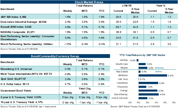 Pro-cyclical areas outside of Technology led U.S. stock markets higher during the first full week of trading in 2026. Key employment data, geopolitical headlines and developments across Washington made for a headline-driven start to the new year.