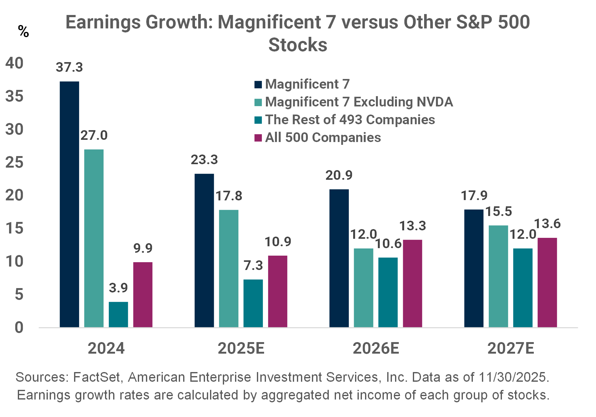 Bottom line: 2026 should be a constructive year for asset prices and economic conditions. That said, investors should also expect fits and starts during the year that will likely challenge their conviction and test their patience. For most investors, this means leaning on strong active management and strategies designed to uncover opportunities beyond the Magnificent Seven. Notably, we believe maintaining exposure to quality-focused approaches can help mitigate concentration risk, while temporary drawdowns may offer chances to deploy excess cash into high-quality growth strategies or rebalance toward strategic targets. And finally, diversification strategies across international markets, alternatives, and real assets (which proved effective in 2025) should remain critical levers to mitigate U.S. valuation risk and potential pullbacks in Big Tech, should they occur next year. After three years of strong gains across major U.S. stock averages, investors would be wise to temper return expectations for next year, take a more selective approach to their investments, and look for company profits to do more of the heavy lifting in driving stock returns in 2026.